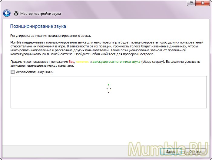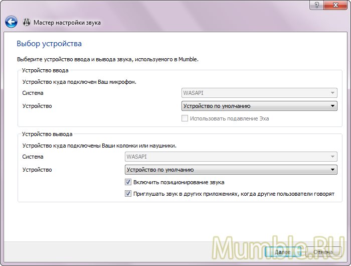 При запуске Mumble открывается помощник настройки, также его можно вызвать в меню Настройки -> Audio Wizard