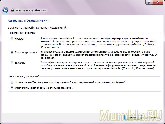 На следующем шаге нам нужно выбрать качество передаваемого звука и способ уведомлений Mumble