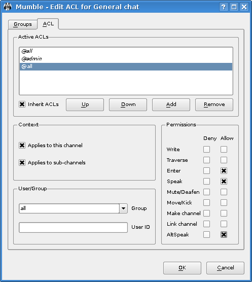 Теперь, мы дадим права каждому человеку который хочет говорить здесь. Для этого изменим ACL (помните о необходимости выбора нового канала перед этим). Вы увидите правила корневого канала, но если вы выберите их, вы увидите, что все параметры выделены. Это потому, что они унаследовали права от родителя канала (в данном случае, Root). Если вы уберете опцию “Наследовать ACL”, они исчезнут, но мы не будем этого делать. Просто добавьте новое правило, которое позволит каждому говорить или AltSpeak и нажмите кнопку ОК для его сохранения. Легко, не правда ли?