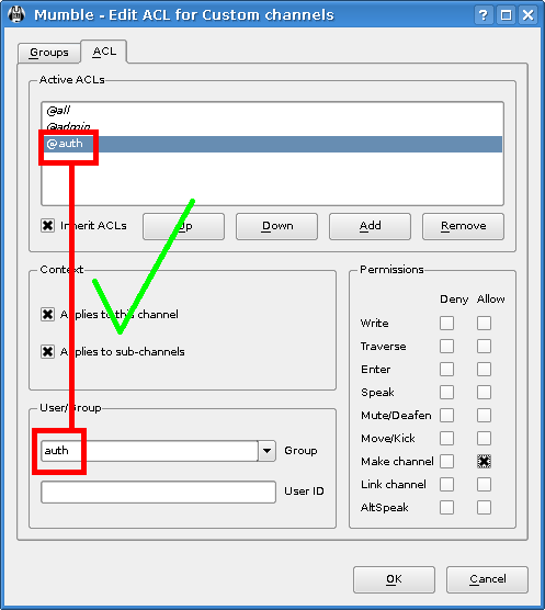 Теперь мы будем раздавать созданым каналам права. Просто зайдите в редактор ACL, добавим новое правило, в списке выберите группу или напишите AUTH и выберите канал установив флажок. Предупреждение: Если вы вводите название группы, убедитесь, что вы нажали клавишу Enter, после того как закончили. Это позволит обновить правила группы. Вы можете видеть, что если вы напечатаете и не нажмете Enter, группу в верхнем листинге не изменится.