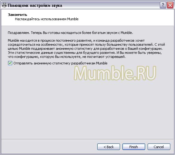 Ну и последним шагом Вам будет предложено отправить анонимную статистику разработчикам Мамбл, дабы помочь им разобраться в направлении развития данного приложения, расставлении приоритетов. Считаем это необходимым, т.к. при этом никакой личной информации передано не будет, а лишь поможет разработчикам сделать Мамбл лучше.