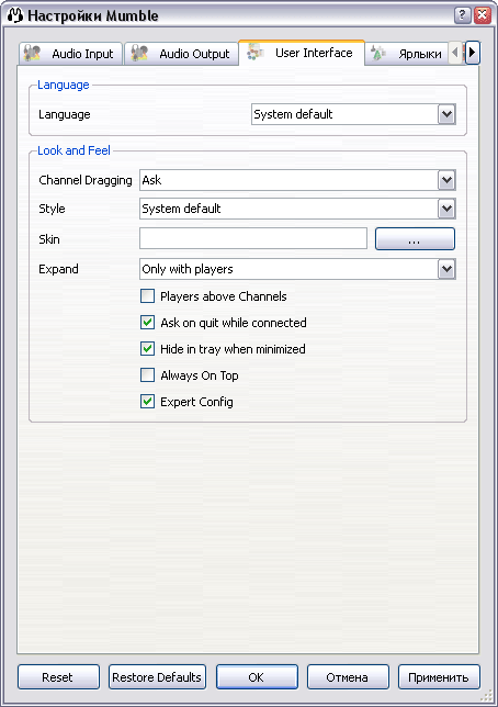 Если вам мешают сообщения событий, всплывающие каждый раз системного трея, выберите пунтк меню Настройка -> Настройка, в появившемся окне Настройки Mumble перейдите на третью вкладу User Interface и установите галку напротив опции Expert Config.