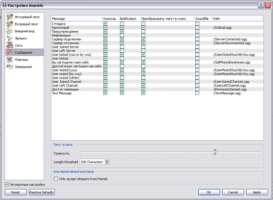 - Настраиваемый звук PTT С новым клиентом Вы можете настроить звук Mumble, который звучит, когда Вы нажимаете или отпускаете кнопку активации голоса.
