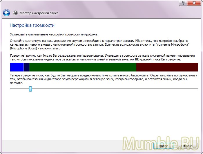 Нужно поставить бегунок так, чтобы все шумы были в синей зоне, а когда начинаем говорить – шкала звука выходила в зеленую зону.