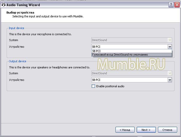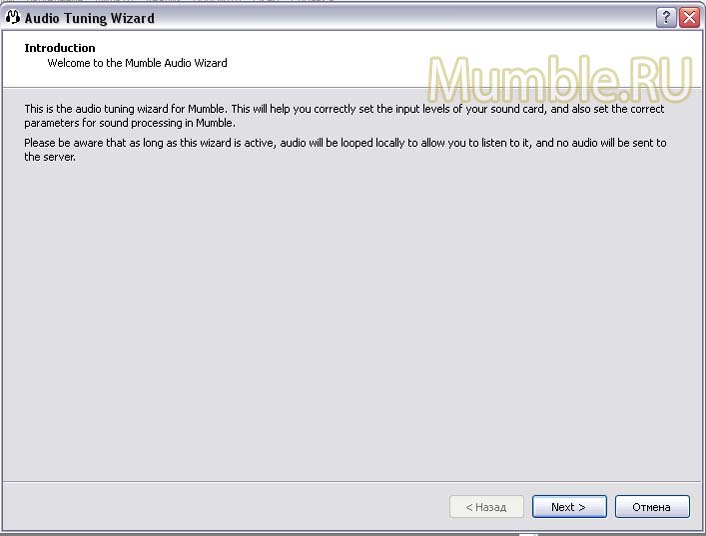 При запуске Mumble открывается помощник настройки, также его можно вызвать в меню Настройки -> Audio Wizard