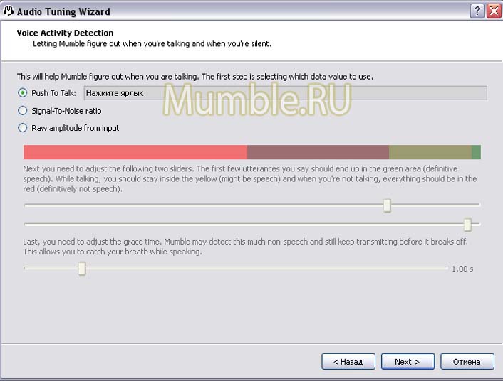 При запуске Mumble открывается помощник настройки, также его можно вызвать в меню Настройки -> Мастер настройки звука