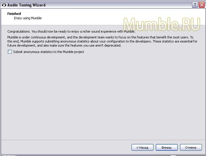 И в завершении нам предложат поучаствовать в сборе анонимной статистике по Mumble, чтобы как-то помочь разработчикам.