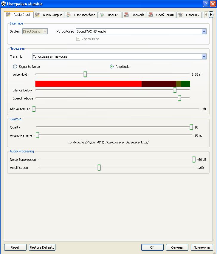 Transmit - определяет как будет активироваться микрофон. Просто голосом или будет требоваться специальная кнопка. "Голосовая активность" - голосом. "Нажмите для разговора" - кнопкой. (для активации кнопкой следует сделать ряд доп. действий, но я об этом уже писал в первом посте)