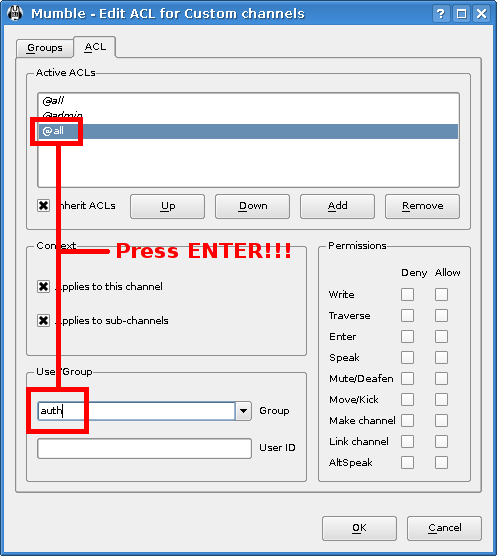 Теперь мы будем раздавать созданым каналам права. Просто зайдите в редактор ACL, добавим новое правило, в списке выберите группу или напишите AUTH и выберите канал установив флажок. Предупреждение: Если вы вводите название группы, убедитесь, что вы нажали клавишу Enter, после того как закончили. Это позволит обновить правила группы. Вы можете видеть, что если вы напечатаете и не нажмете Enter, группу в верхнем листинге не изменится.