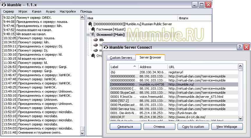 Положение дел Мы выпустили новую версию 1.2.0 Mumble 10 декабря, 2009. В этой версии используется новый протокол между клиентом и сервером, т.е. клиент 1.2.0 совместим только с серверами 1.2.0 или более новыми, клиент 1.1.8 не может подключаться к серверам версии 1.2.x. Новый протокол легко расширяется, поэтому проблемы несовместимости больше не повторятся. Если сервер, которым вы пользуетесь версии 1.1.8, то в пакет версии 1.2.0 включен клиент совместимый с серверами 1.1.х.