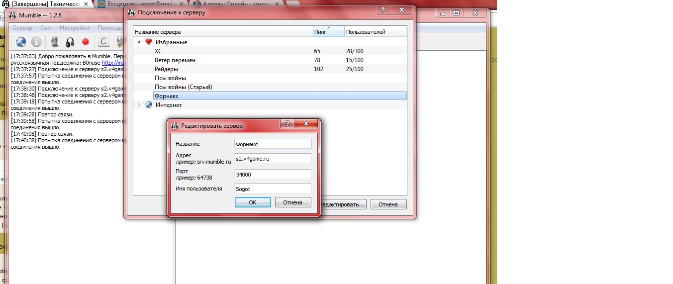 подскажите пожалуйста..Не могу зайти в мамбл.Кнопка подкл.отсутствует.пишет что не соединяет с главным сервером.Что делать?Уже все перепробовал(