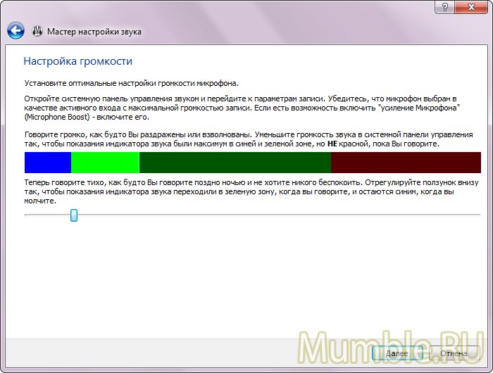 Следующим шагом будет настройка микрофона Нужно поставить бегунок так, чтобы все шумы были в синей зоне, а когда начинаем говорить – шкала звука выходила в зеленую зону. Если у вас шкала постоянно выходит в красную зону или находится постоянно в синей – настройте микрофон в системных настройках Вашего компьютера.