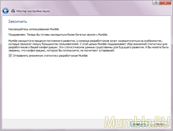 Настройка источников звука поможет правильно воспроизвести их позиционирование И в завершении нам предложат поучаствовать в сборе анонимной статистике по Mumble, чтобы как-то помочь разработчикам. Определенную статистику по использованию Mumble можно посмотреть тут http://stats.mumble.info/