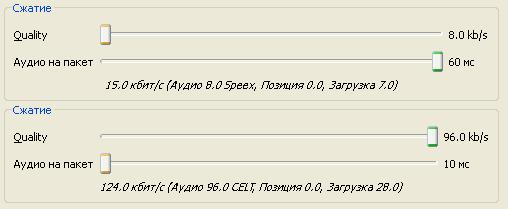 Mumble использует новый кодек - CELT, который обеспечивает примерное качество звука в 48КГц, но важнее всего, он позволяет сократить длительность аудио на пакет до 10мс (милисекунд), а это вдвое меньше, чем раньше. Все это ведет к отличному качеству звука и малым задержкам, в сравнении с версией 1.1.8. Также, все это потребует бОльшей пропускной способности канала. Поэтому мы сохранили кодек Speex, желая добиться высокого качества связи в ситуациях, когда нет возможности пользоваться каналом с хорошей пропускной способностью. Mumble автоматически выбирает лучший кодек для Ваших установок Качество и Аудио на пакет, и, следовательно, может работать в условиях большой и низкой пропускной способности канала.