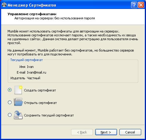 При первом запуске Mumble, пользователю предложат создать сертификат с помощью «Менеджера сертификатов». В сертификате использована высокая степень защиты с открытым ключом для простой и однозначной идентификации пользователя на сервере, без передачи каких либо паролей или другой конфиденциальной информации. Если сертификат будет утерян, то все ваши регистрации на серверах будут потеряны, поэтому создание резервных копий сертификата обязательно и должно быть обыденным. Пользователи, у которых уже есть сертификат, могут заменить его без проблем, подобно тому, как доверенный сертификат может быть заменен любым другим доверенным сертификатом по какому-либо признаку идентифицирующему пользователя.