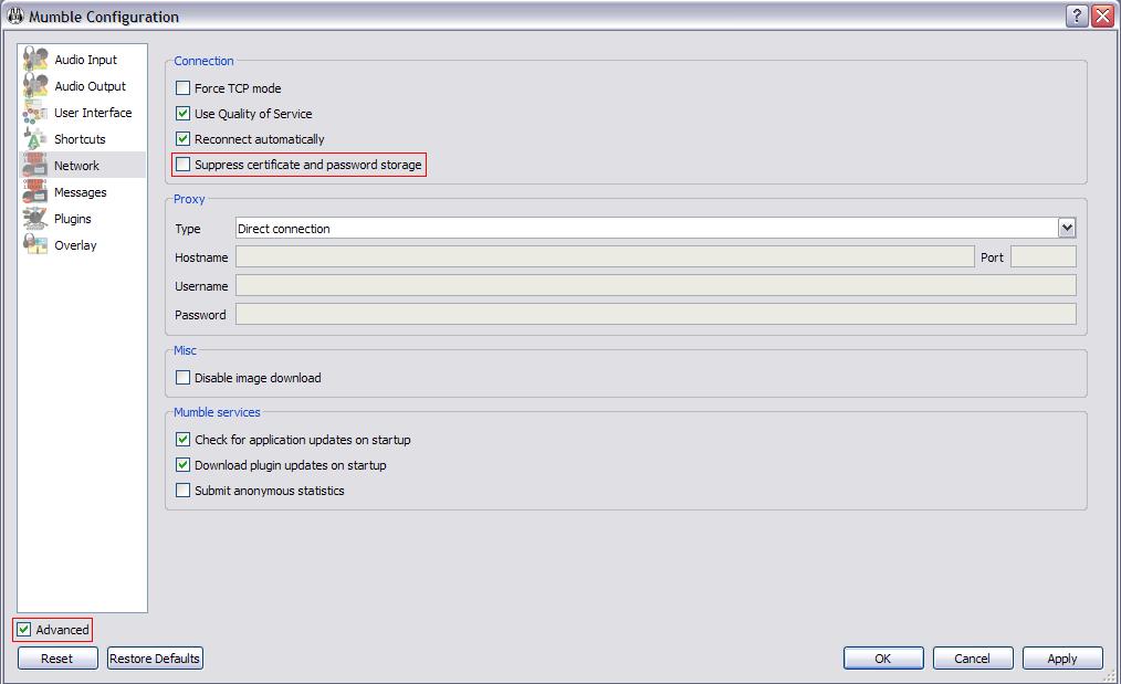 В моем случае галочка ставится, но, после перезагрузки клиента, исчезает. Возможно стоит перейти на другую версию (у меня 1.2.1 стабильная) ?B0nuse писал(а):В том случае, если компьютер, с которого Вы используете клиент Мамбл, используется разными людьми, то Вам необходимо поставить галочку Supperss certificate and password storage на вкладке Network, которая появится после того, как Вы установите галочку Advanced для включения режима Экспертных настроек Мамбл. Таким образом, Вы запретите клиенту передавать какие либо пароли и данные сертификата на сервер