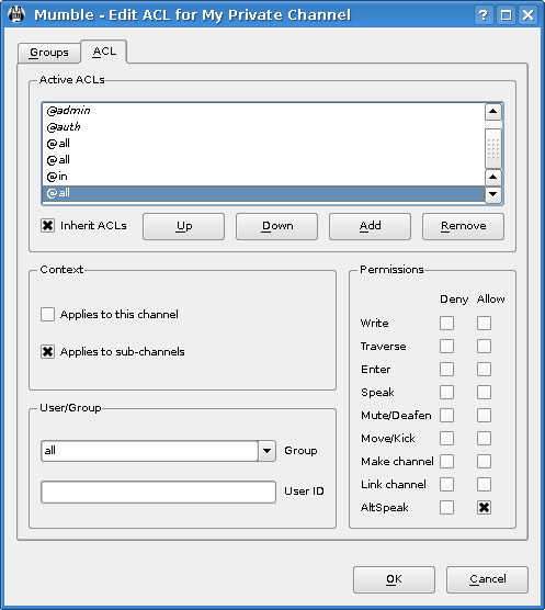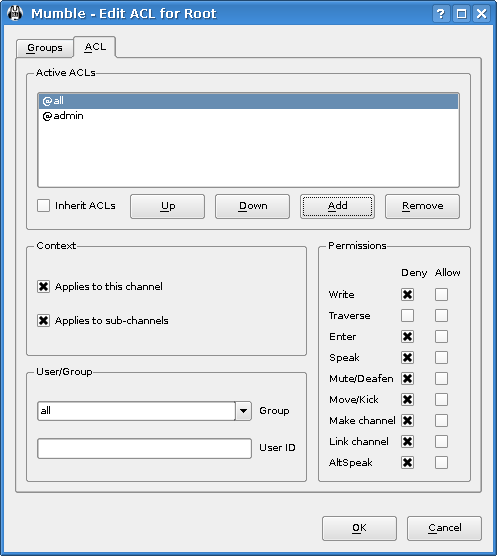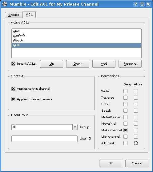 Теперь, мы дадим права каждому человеку который хочет говорить здесь. Для этого изменим ACL (помните о необходимости выбора нового канала перед этим). Вы увидите правила корневого канала, но если вы выберите их, вы увидите, что все параметры выделены. Это потому, что они унаследовали права от родителя канала (в данном случае, Root). Если вы уберете опцию “Наследовать ACL”, они исчезнут, но мы не будем этого делать. Просто добавьте новое правило, которое позволит каждому говорить или AltSpeak и нажмите кнопку ОК для его сохранения. Легко, не правда ли?