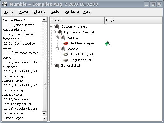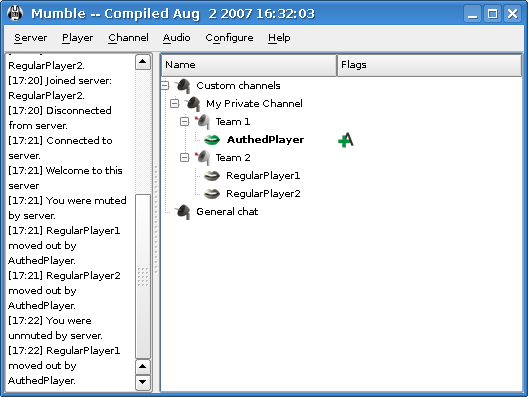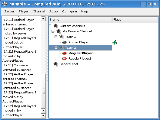 В этой части мы запустим зарегистрированного игрока в группе auth с очень оригинальным именем: “AuthedPlayer”. Он будет создавать свои собственные каналы , небольшой общественный канал и два частных подканала, один для каждой группы игры. Мы бы хотели чтобы они могли говорить со своей группой или с обеими группами сразу. Мы увидим, как сделать это с правом AltSpeak, связывая каналы и многое другое.